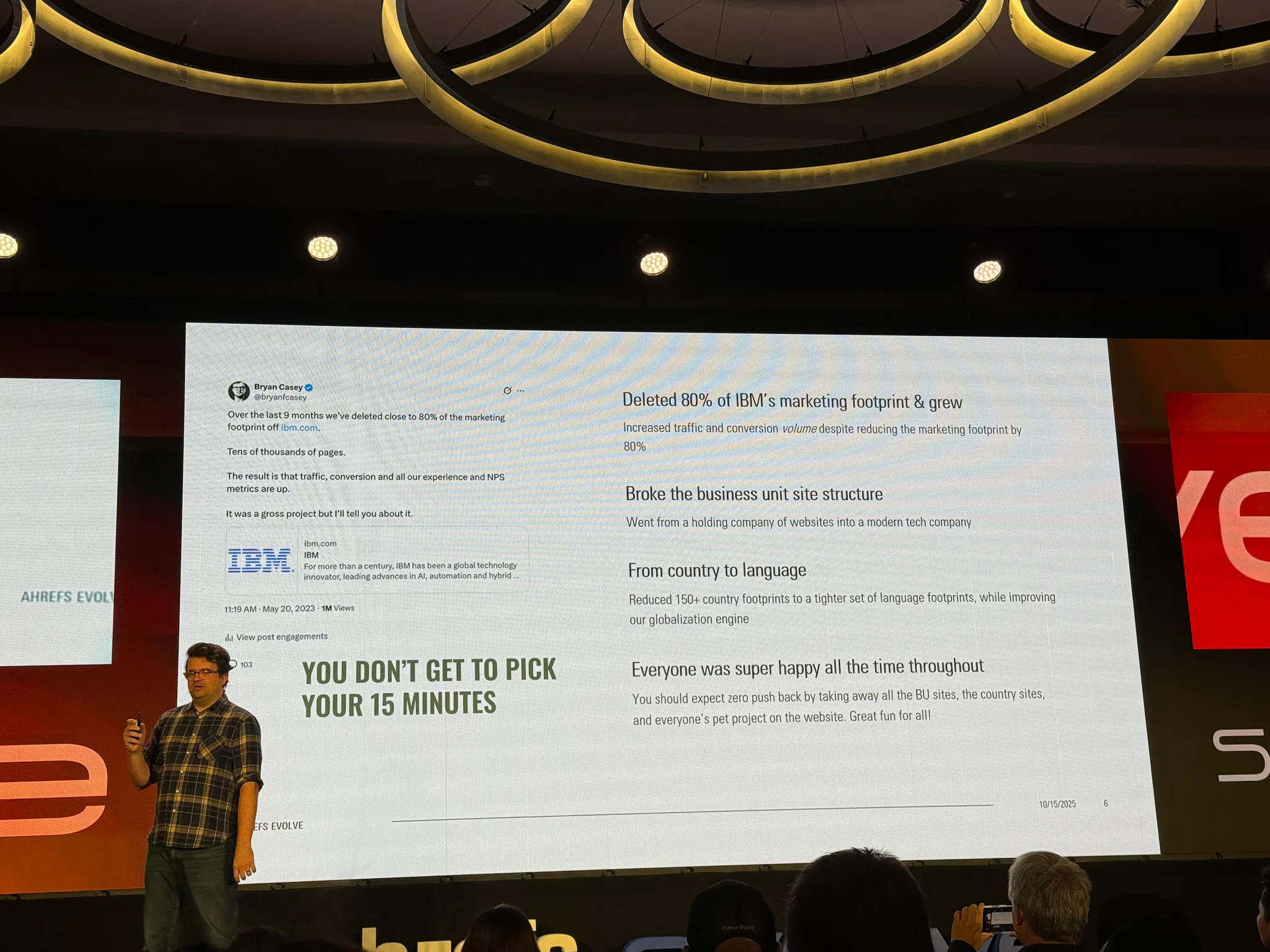 IBM은 오가닉 트래픽 불모지에서 별도 인큐베이션 팀을 6년간 운영하며 웹사이트 80% 제거, 160개 국가 사이트를 언어별로 통합하고 팟캐스트·뉴스레터 등 현대적 미디어로 전환했습니다. AI 시대에도 검색은 다른 채널보다 34% 효율적이며, 성공 핵심은 담당자 신뢰 구축, 콘텐츠 제작 효율화, SEO와 다른 마케팅 활동을 연결한 통합 전략이었습니다.